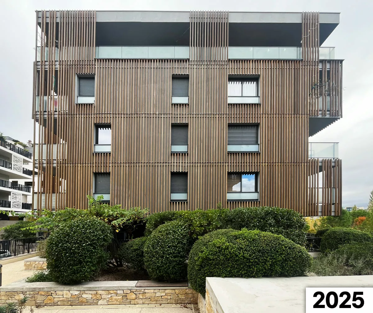 Après 9 ans, le saturateur initial laisse progressivement place à une évolution homogène et naturelle, fidèle au vieillissement attendu d’un bardage extérieur en Red Cedar. Le matériau conserve sa noblesse, son homogénéité et son caractère, preuve d’un choix technique et constructif durable.