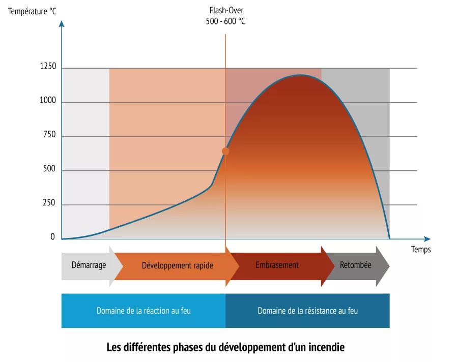 Fire resistance characterizes the behavior of a structure facing a fire. When a fire grows, the collapse of the building must be avoided and the spread of flames must be minimized. French regulations speak of fire stability (SF) to designate the bearing capacity of a structure, flame retardant effect (PF) to designate the fire and hot gas sealing-effect of a wall (door, partition) and finally a firebreak effect (CF) to designate fire resistance with thermal insulation (controlled temperature rise on the unexposed side).