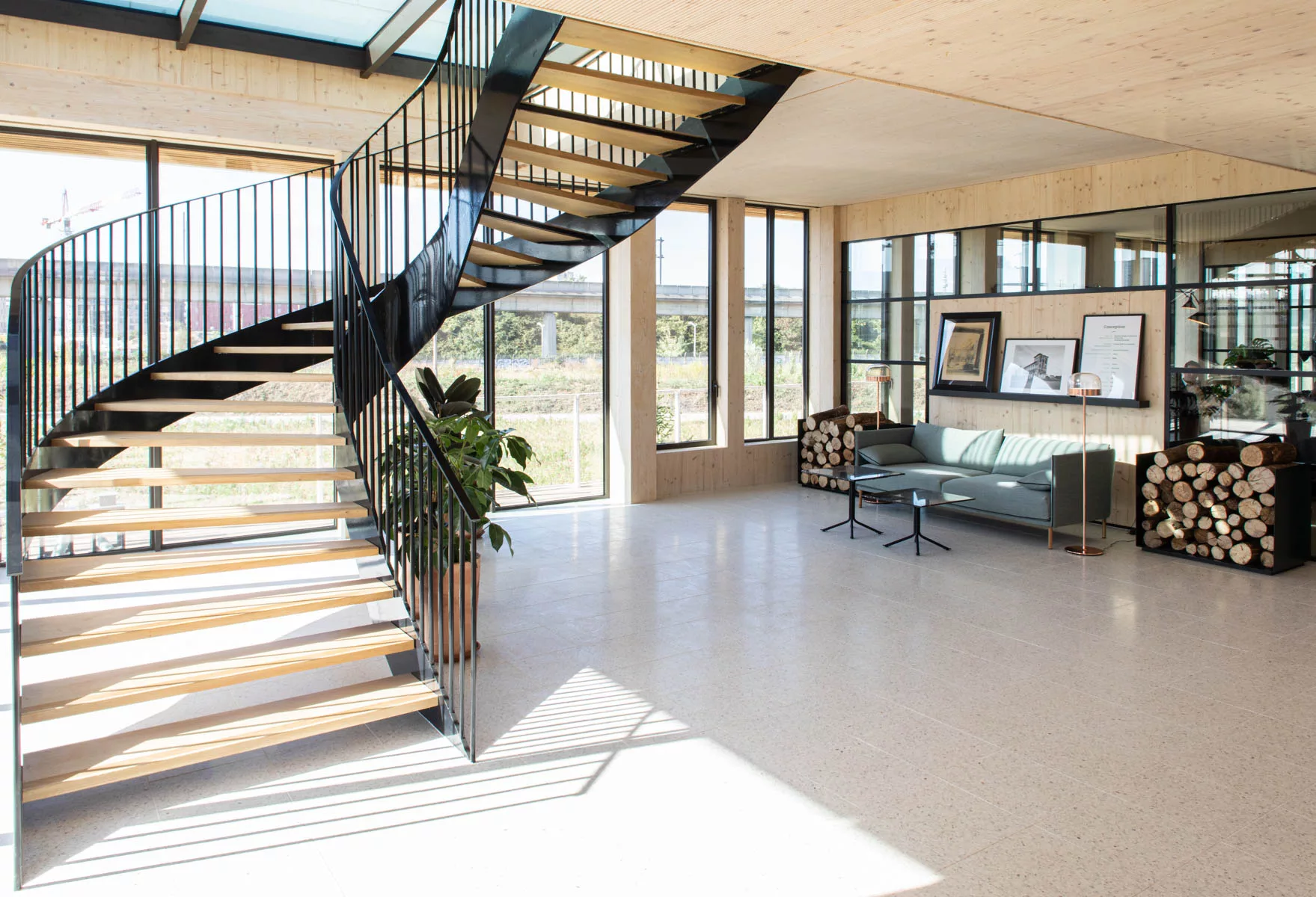 This 500-sqm building makes it possible to get a first idea of future workspaces, bathed in light thanks to the large bay windows, spacious and open to the outside, with balconies and terraces. The false ceiling is replaced by an apparent CLT wooden slab, lined right through with the Ignipli® Acoustic flame retardant Euroclass B from Woodenha Industries. In addition to the reaction to fire satisfying ERP regulations, the Ignipli® Acoustics used are grooved to provide optimal sound absorption required in this type of “open” space. The exposed wood thus creates a soothing working atmosphere.