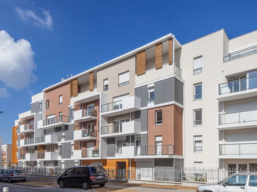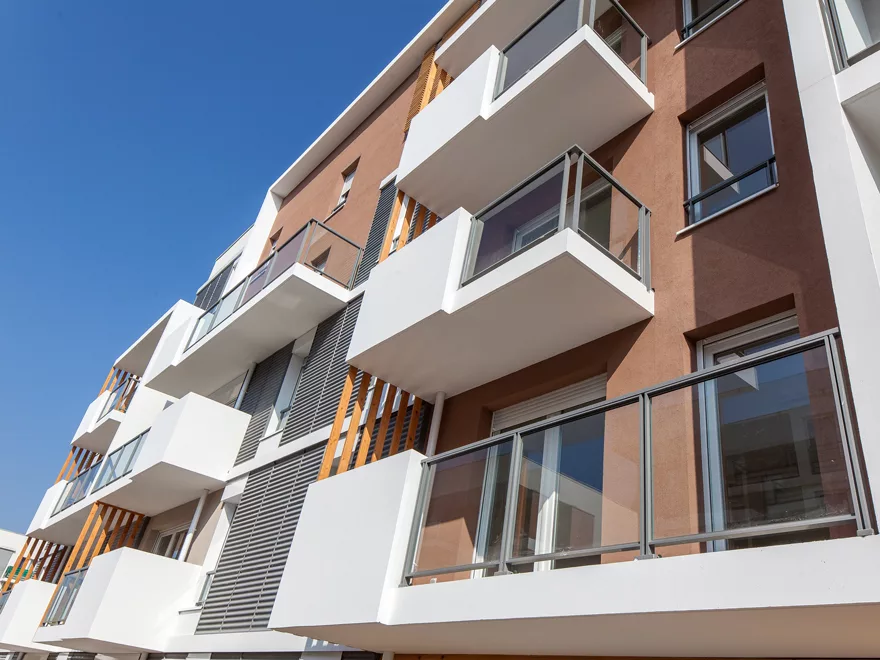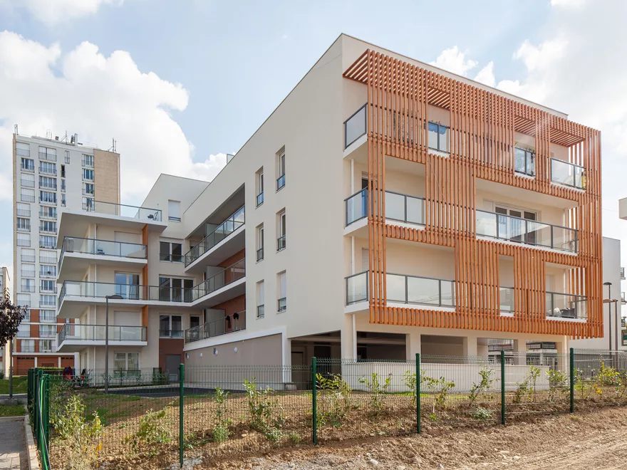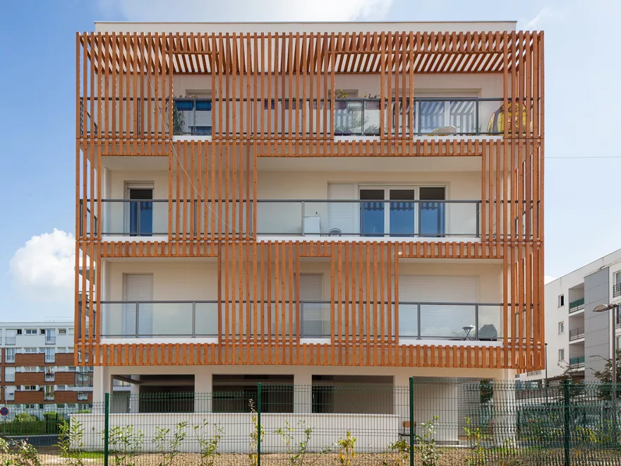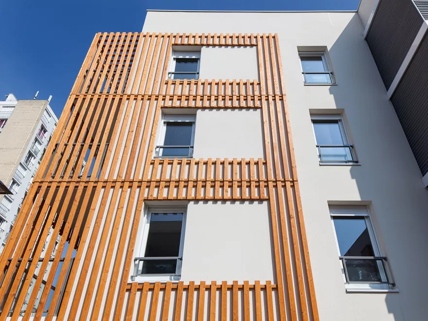 Pour l’habillage de la façade ouest du St Exupéry, Lanctuit Architectures a conçu un claire voie en mélèze; ce bardage est ignifugé Euroclasse C (M2) avec le procédé BIME®1 de Woodenha. Les brise-soleil sont également ignifugés par ce procédé