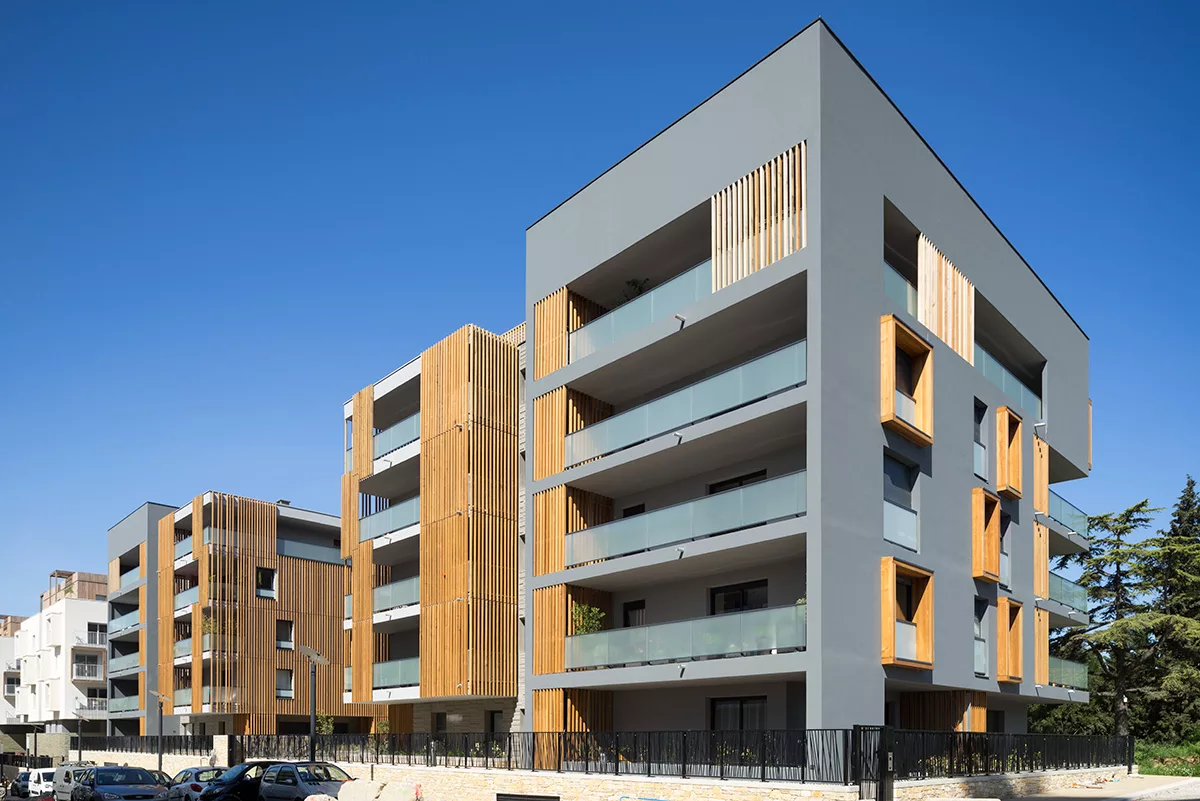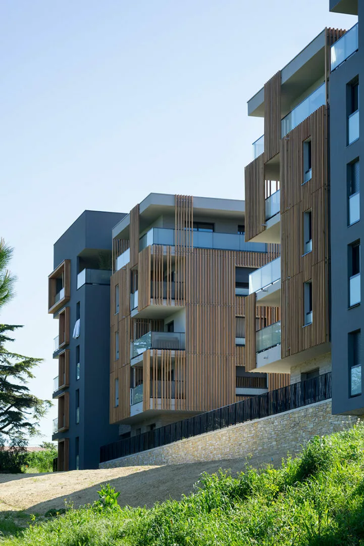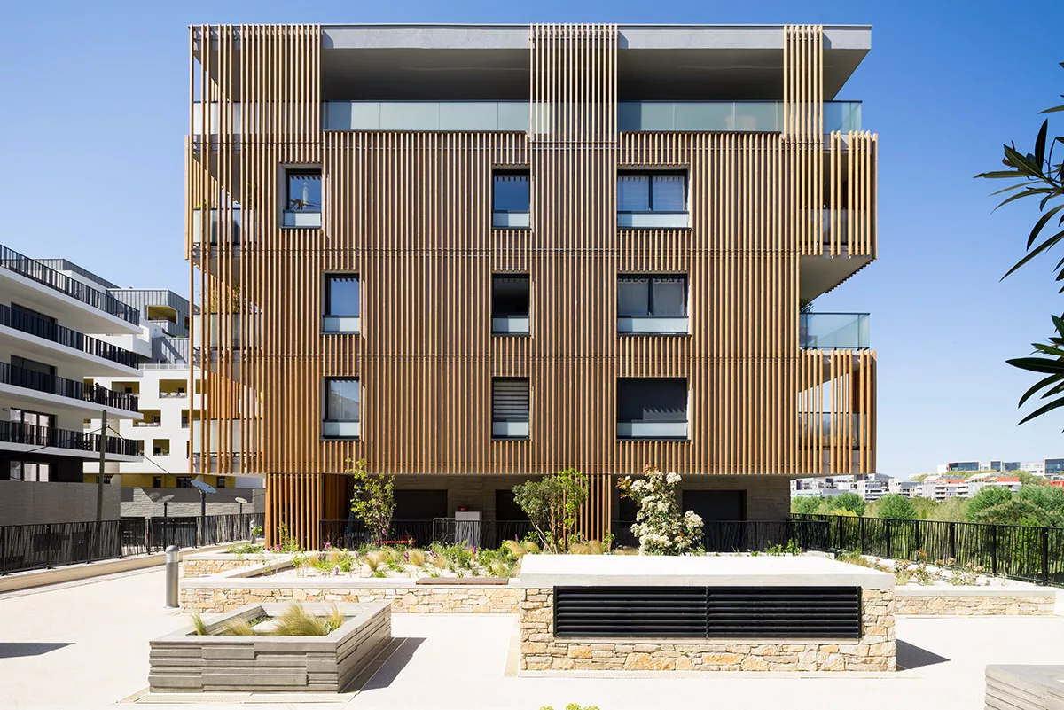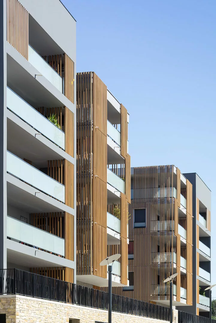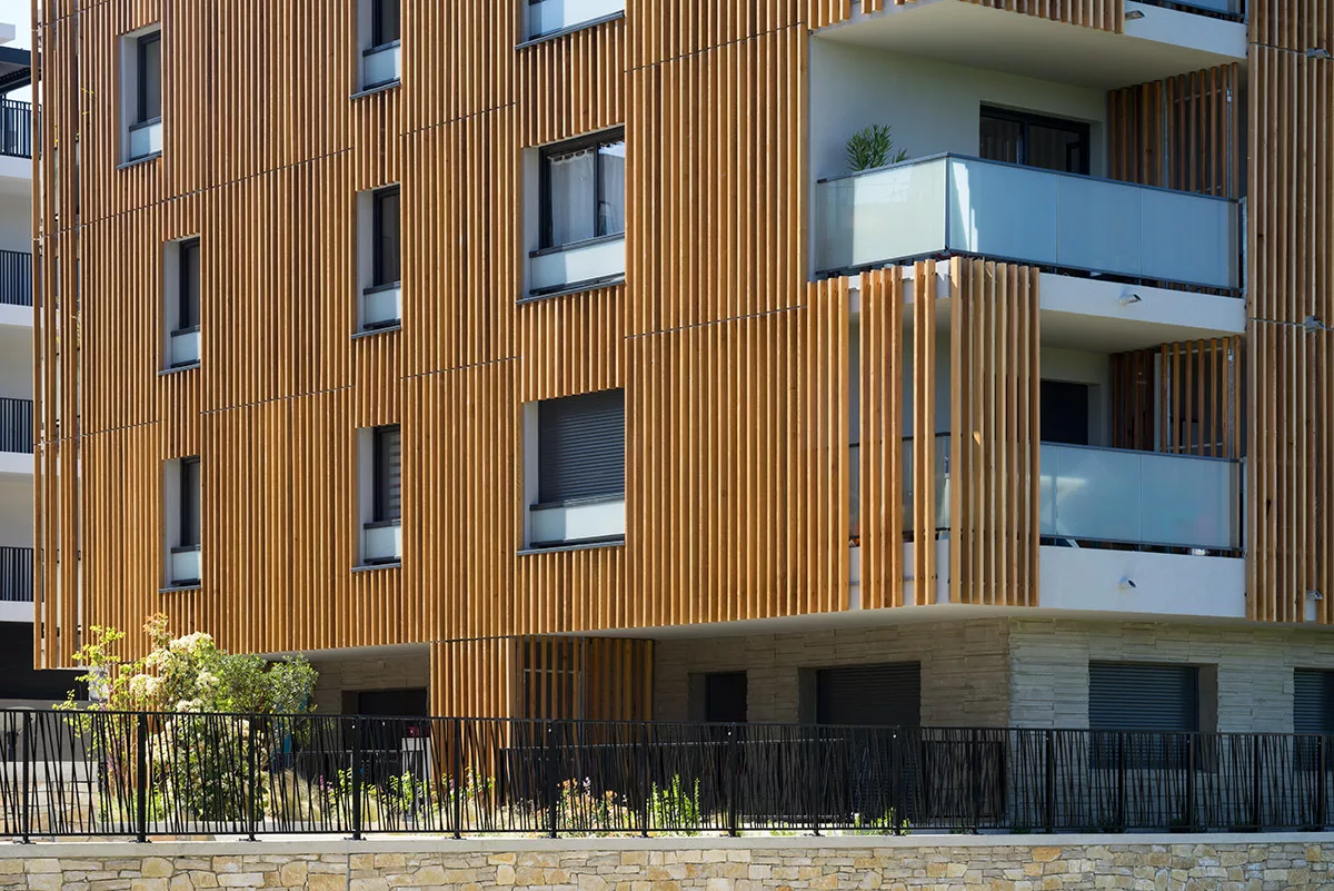 Cette résidence d’habitation de 2400 m2 livrée fin 2016 est la réalisation du cabinet d’architectes Kern + Associés. Le bardage utilisé sur plus de 60% des façades est constitué de pièces en Red Cedar ignifugées par imprégnation et recouvertes de notre saturateur BIME®F1 ton sur ton. Le claire-voie rythme la façade et fait le lien entre la rigidité du béton grisé et la verdure flamboyante du Parc.
