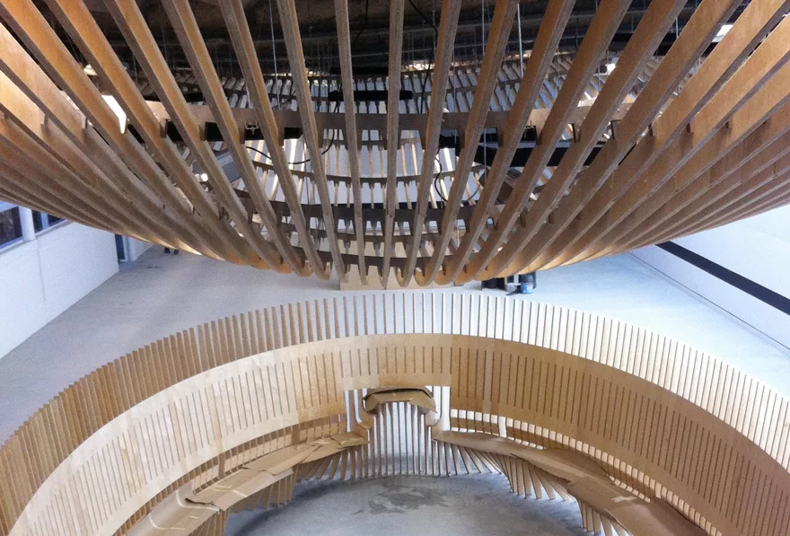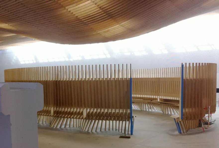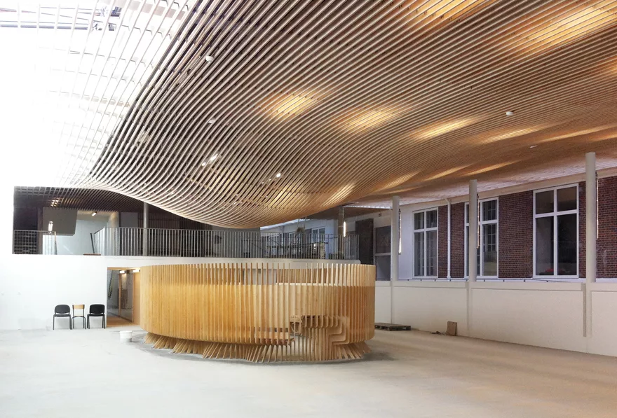 Restructuration de la salle de demi-pension du lycée La Bruyère à Versailles. À travers un matériau unique, le plafond devient l’élément fédérateur du volume des convives tout en s’adaptant à chacun des espaces particuliers; la salle des enseignants, la mezzanine et la ligne de distribution. Le plafond en lames courbes ainsi que l’alcôve pour les professeurs sont en contreplaqué bouleau ignifugé M1 par Woodenha dans la masse, en autoclave vide-et-pression. Ces aménagements spéciaux ont été conçus, réalisés et posés par les équipes de Metalobil (Nantes)