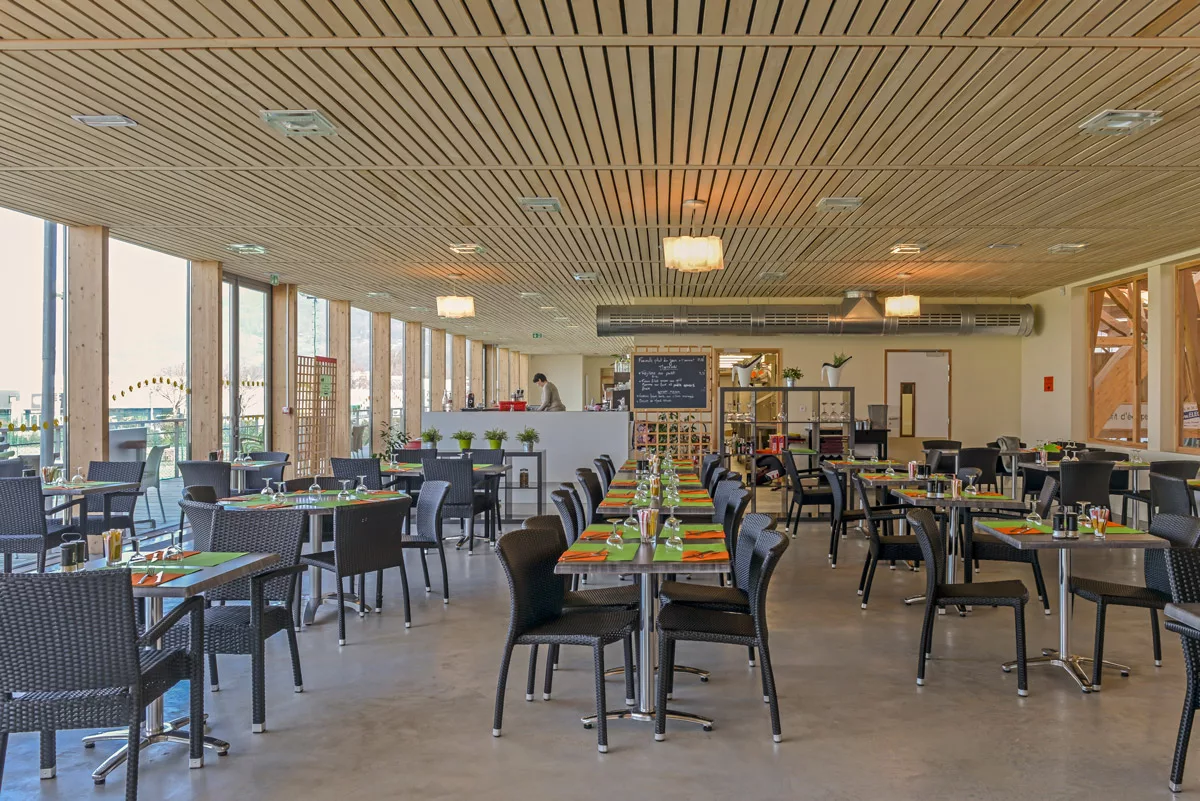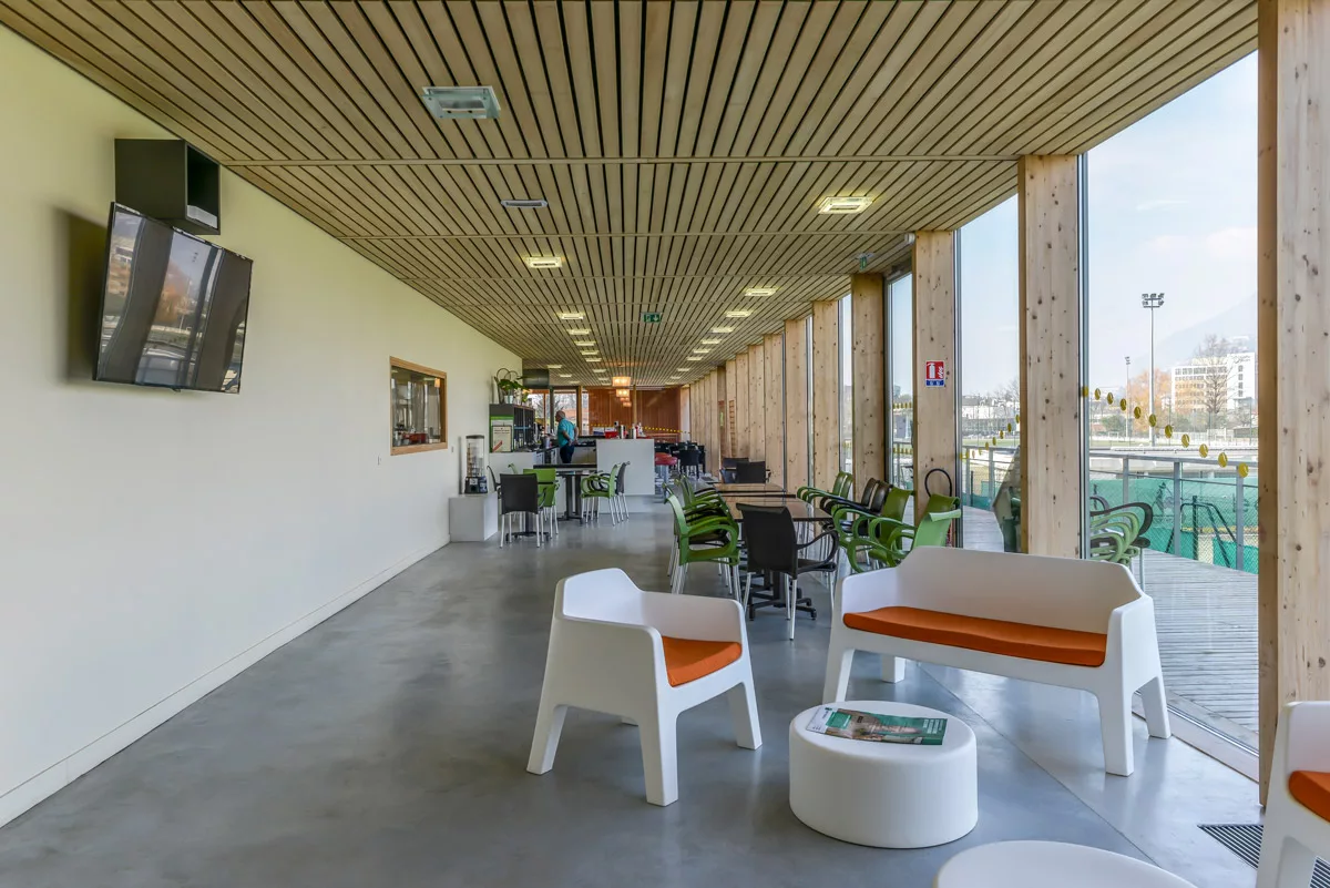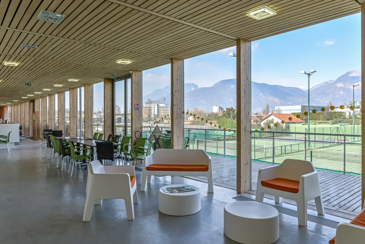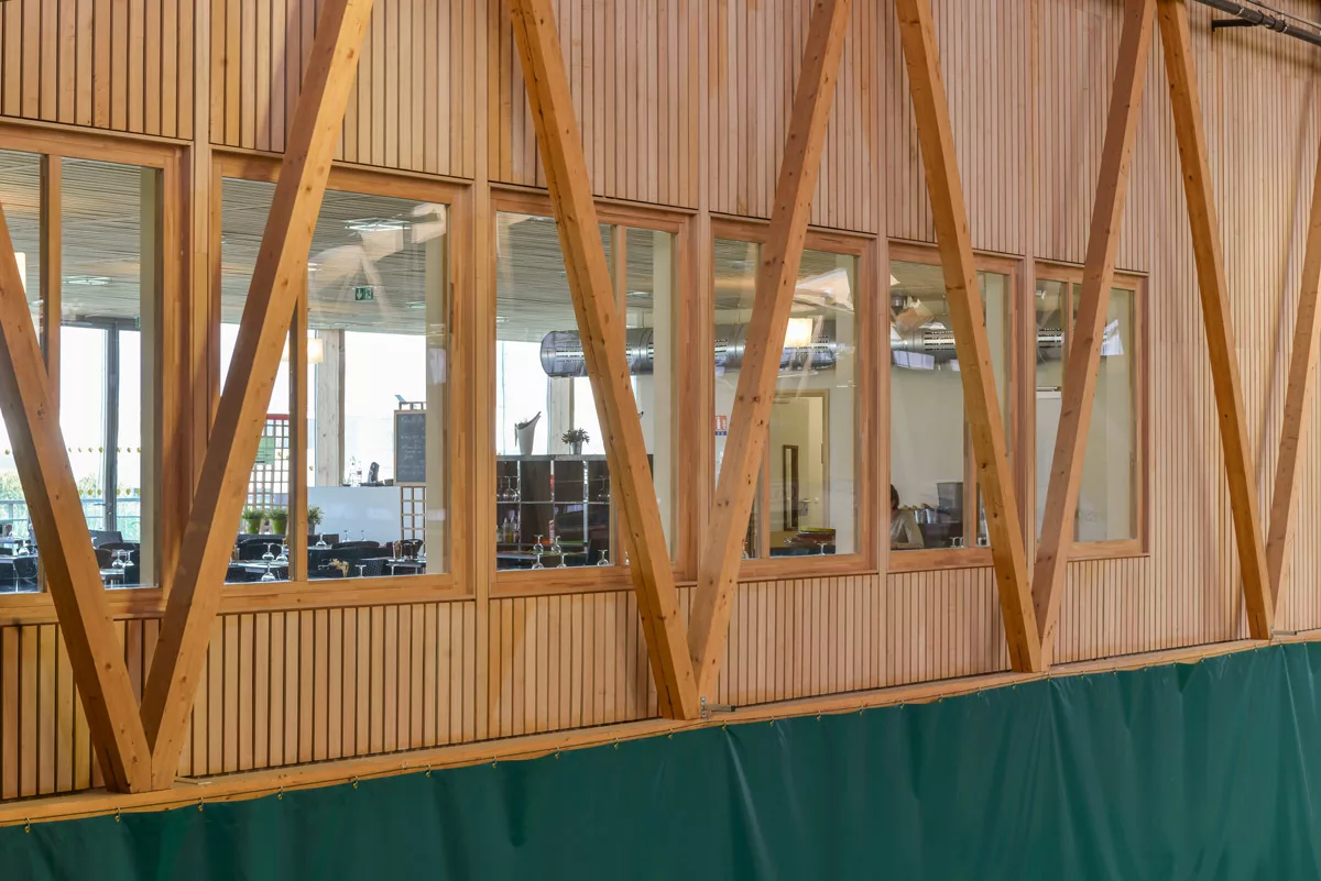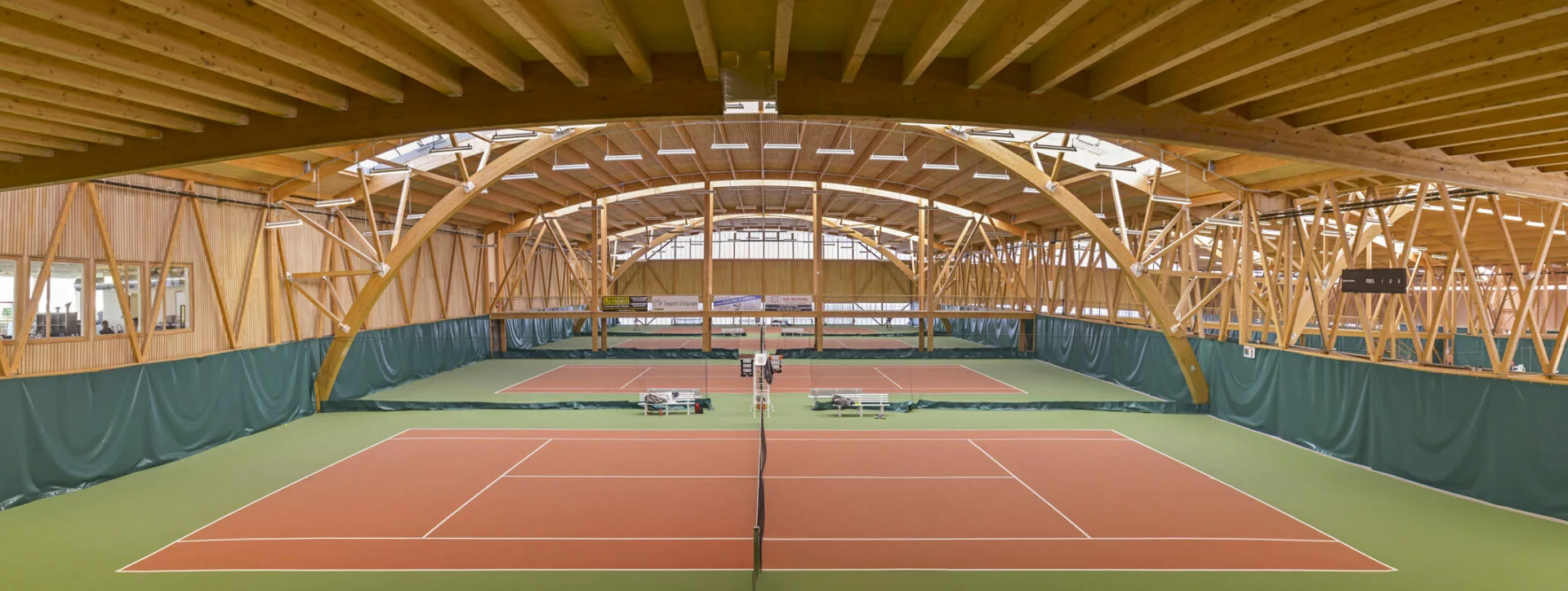 L’ouvrage conçu par R2K Architectes & Roda Architectes comprend 12 terrains couverts, 8 en résine, 4 en terre battue, de 36×18 mètres, permettant d’accueillir des tournois de haut niveau. Le nouveau bâtiment construit selon des normes environnementales strictes comprend en outre une salle de fitness, des salles de kiné, un restaurant et une terrasse donnant sur les 10 terrains extérieurs. Le bois y a la part belle, en particulier à l’intérieur ou de la volige en peuplier ignifugée en autoclave par Woodenha recouvre les voutes de plafond et la plupart des murs.