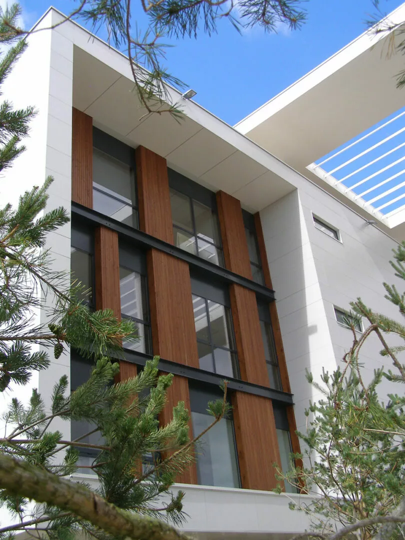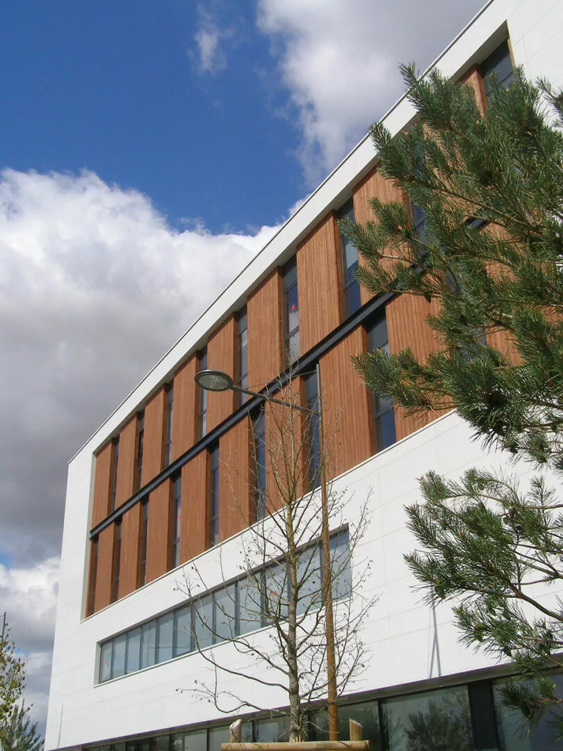 Les bardages en douglas de ce bâtiment de bureaux ont reçu un traitement autoclave ignifuge et un saturateur non déclassant de protection et de finition. C’est le bardage Euroclasse B BIME©1.