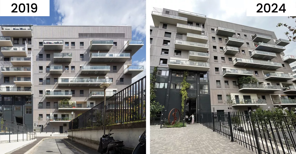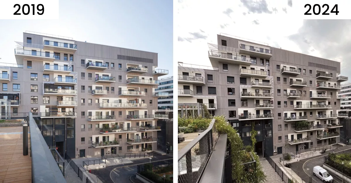 🏆 5 ans après – Résidence le Bachelard à Paris 75014 – Bardage douglas ignifugé BIME®.